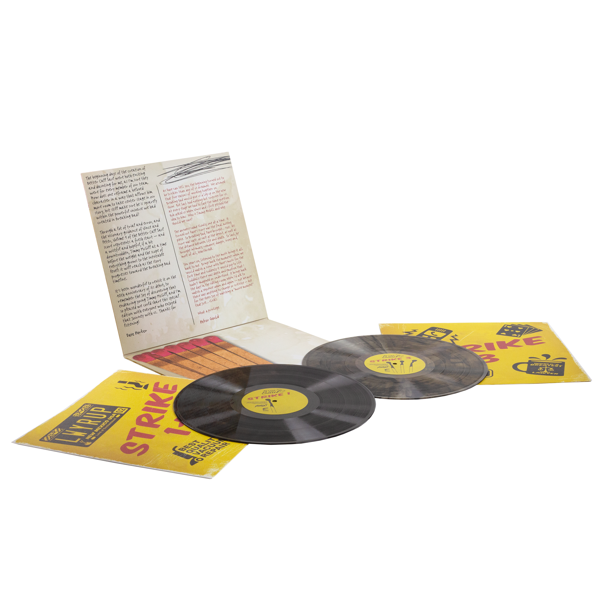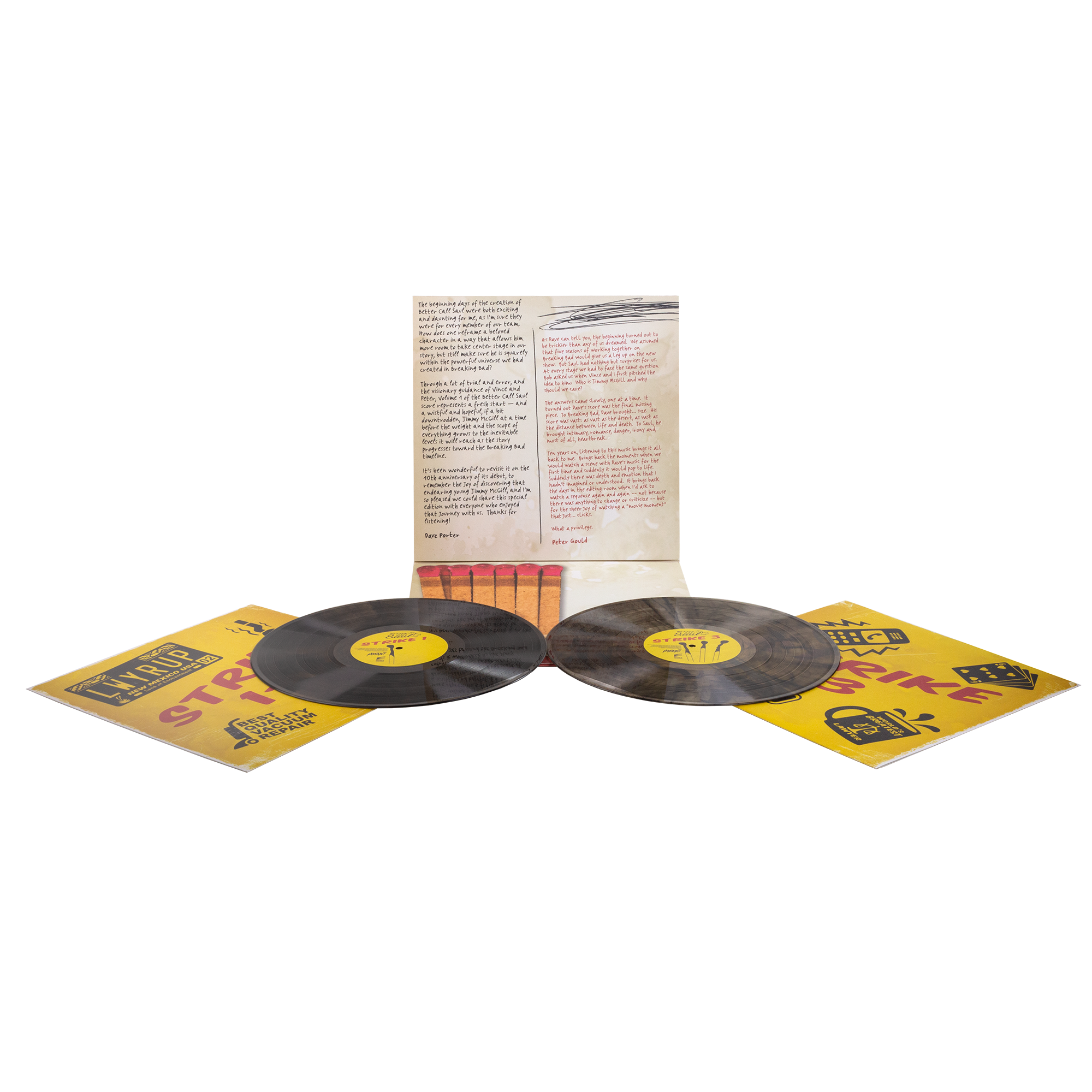Pressed on 2x 140 gram Match Smoke Vinyl, this double LP is housed in a vertical “matchbook” gatefold with liner notes by Porter and Showrunner Peter Gould.